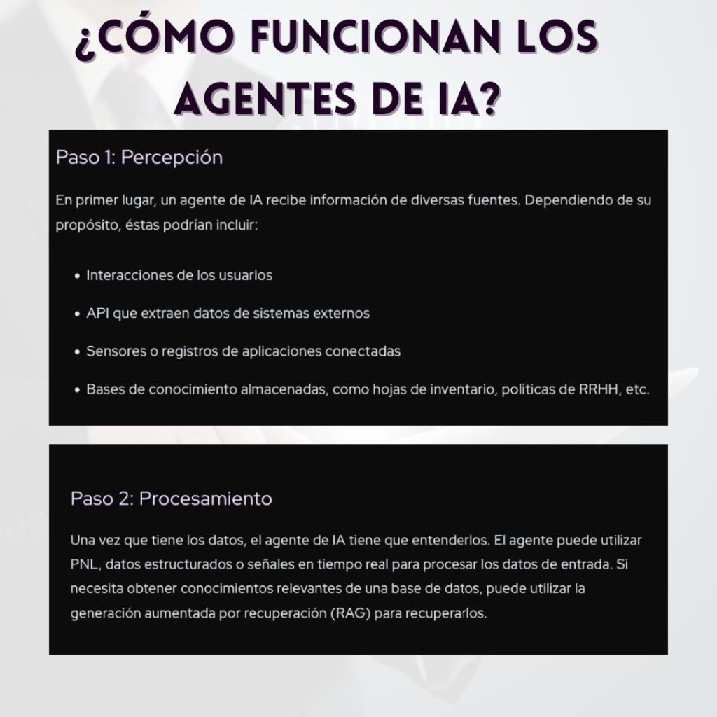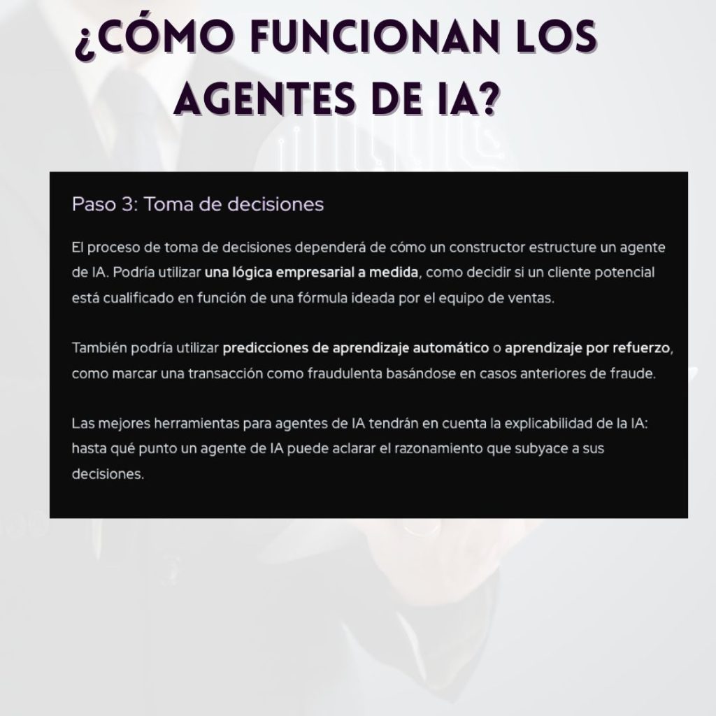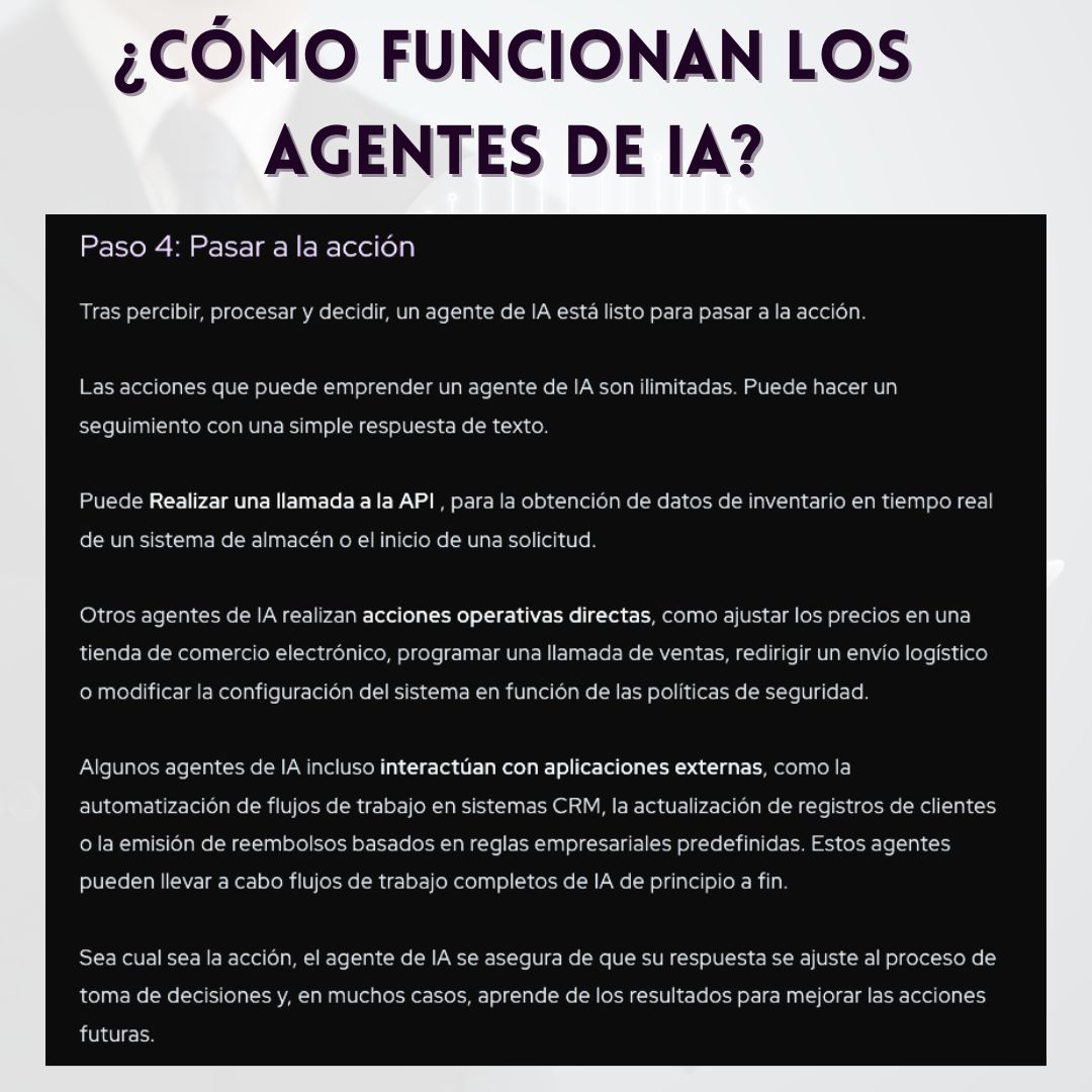 Sea cual sea la acción, el agente de IA se asegura de que su respuesta se ajuste al proceso de toma de decisiones y, en muchos casos, aprende de los resultados para mejorar las acciones futuras.